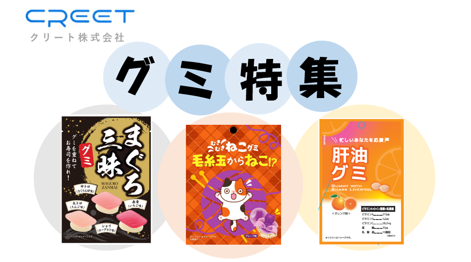 クリート グミ特集(むきむきねこグミ/肝油グミ/まぐろ三昧グミ)