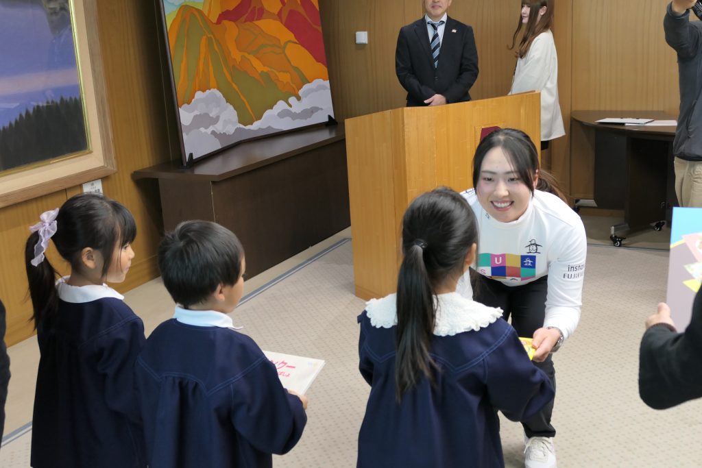 熊本県庁にて行われた贈呈式では、代表として玉名市の小天保育園の園児に竹田プロから世界の絵本セットが直接手渡されました。