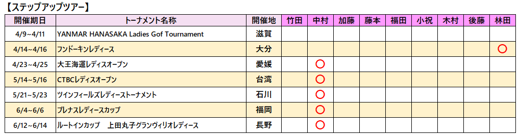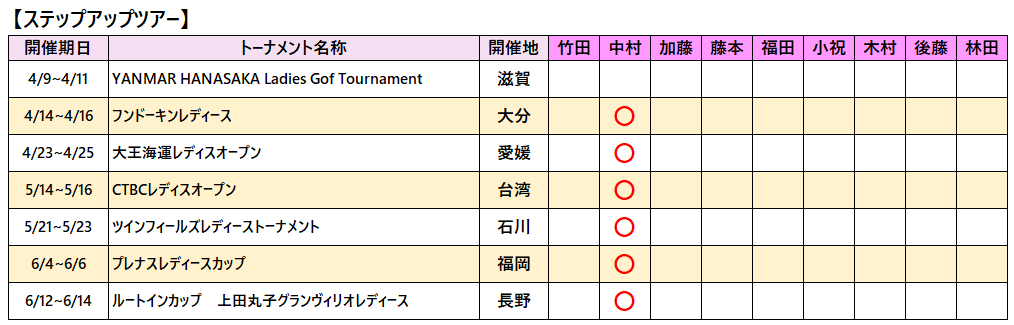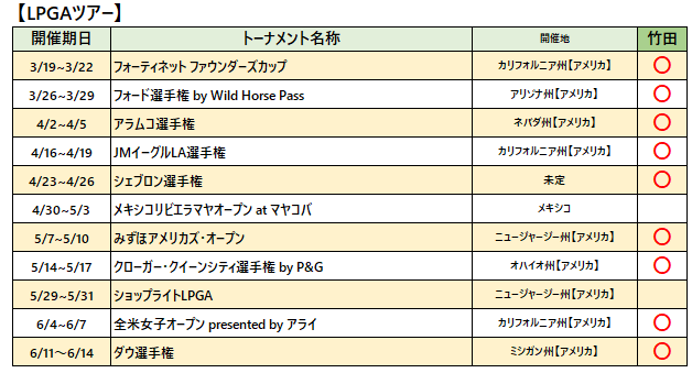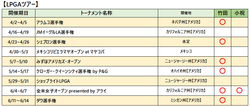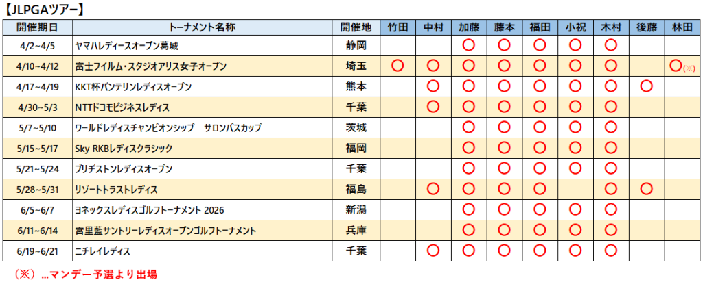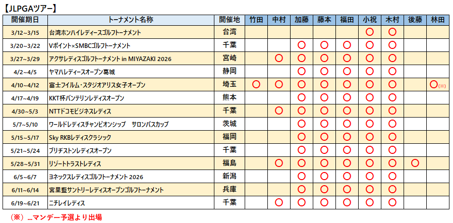 各選手の2026年ツアー出場予定をお知らせいたします。