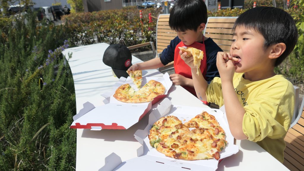 さぁ、お待ちかねの実食です!子どもたちはお互いのオリジナルピザを交互に食べながら「ここが美味しい!」「ここの部分がいいね!」など感想を言い合い、興奮気味に食べていました。自分たちで作ったオリジナルピザは、やはり特別感があったようですね。