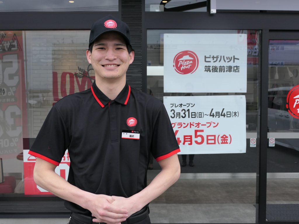 「筑後前津店は、売上は当然ですが、お客様の満足度の高い店を目指します。地域のイベントにも積極的に参加しピザハットのファンを増やしたい。これまで優秀な先輩方に教えていただいた店舗運営のノウハウをこれからは自分が実践しクルーに伝えたい」と熱く意気込みを語ってくれました。