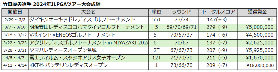 竹田麗央選手は2003年4月2日、熊本・合志市生まれ。21歳。6歳の時、母の影響でゴルフを始め、熊本国府高1年時の19年九州ジュニアで優勝。21年11月のプロテストに合格し、22年からツアー参戦。竹田麗央選手は今回の優勝スピーチで「この大会は子どもの時から観戦に来ていた大会で、まさか自分が優勝できるなんて思っていなかった。すごくびっくりしていますし、うれしいです。また来週からもたくさん優勝争いして、2勝目を早く挙げられるように頑張ります。今日はありがとうございました。」と話し、初々しい笑みを浮かべていました。