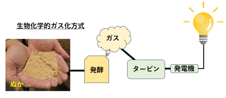 「バイオマス」とは、動植物などの生物からつくり出されるエネルギー資源のうち、石油などの化石燃料を除いたもののことで、それを利用し、発電する再生可能エネルギー発電方法を「バイオマス発電」と言います。バイオマス発電は、大きく3つの種類(直接燃焼方式・熱分解ガス化方式・生物化学的ガス化方式)に分けられ、その中の「生物化学的ガス化方式」で福岡農産の米ぬかは使用されています。