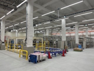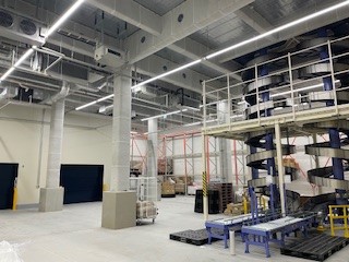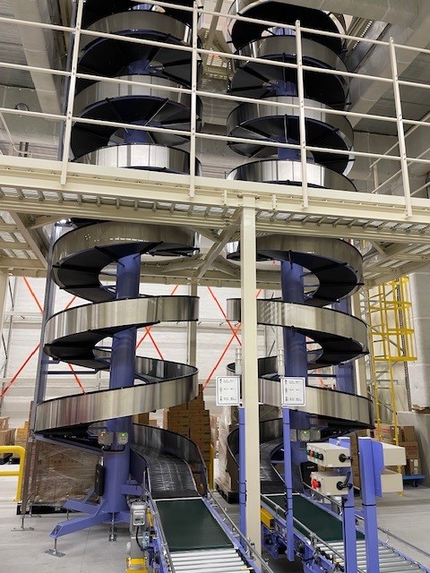 1階と2階が物流倉庫になっており、今回導入した2基の製品を移送するスパイラルコンベアは物流効率化の最前線を支える画期的な設備です。このスパイラルコンベアは、2階倉庫までの高さ8mを1時間あたり1,600箱昇降させる能力を備えています。