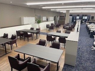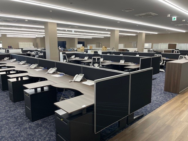 3階の事務所では、ブルーを基調として洗練されたデスク周りを新調し、社員がリラックスして仕事に取り組める空間を実現しています。