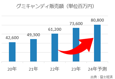 現在、グミ市場はますます拡大傾向にあります。また、SNSのコンテンツでも人気の話題となっており、子供だけでなく、幅広い世代が手にするお菓子の一つとなっています。