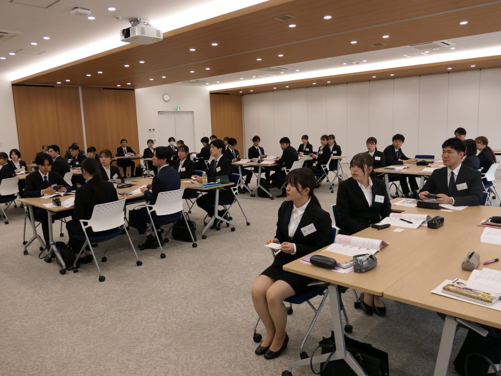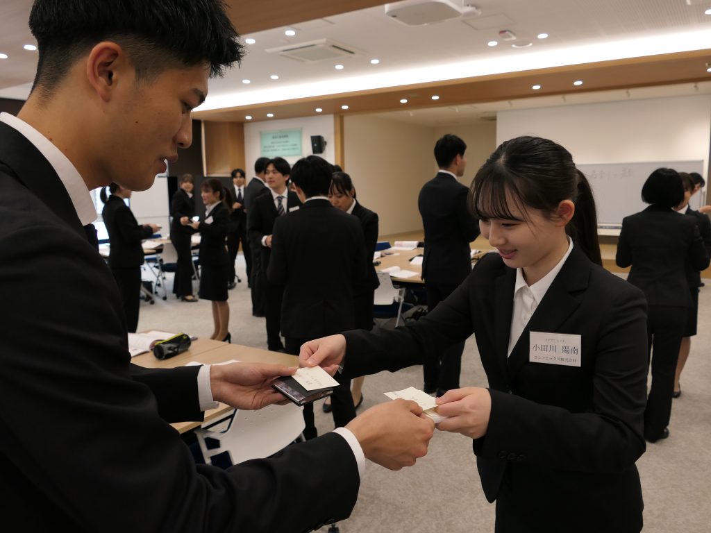 まずは、社会人としての基本姿勢、仕事をするうえでのコミニケーション等を学びます。名刺交換のマナーも学びます。初めての名刺交換を緊張した面持ちで行いました。