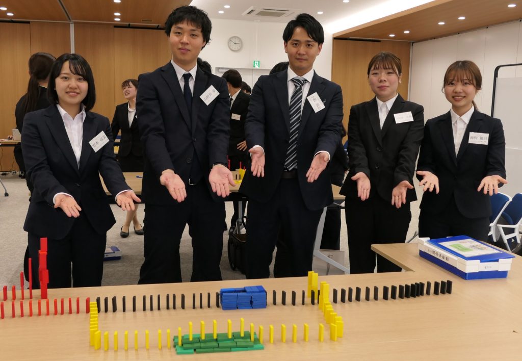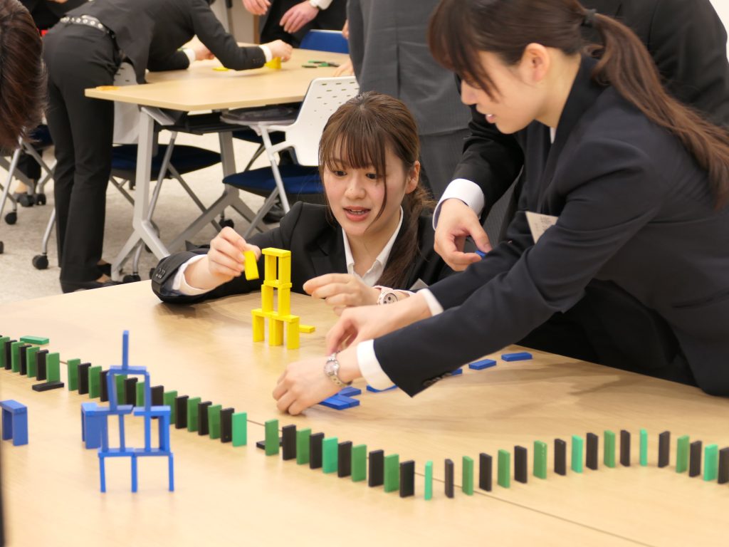 チームワーク発揮のためのグループワークでは、ドミノを使い仕様書の通りに構造物をつくるミッションに挑戦しました。役割分担を行い、コミニケーションをとりながら作業を進めていきます。1回目の後は反省点や、次回に向けての作戦をたて2回目に挑みます。