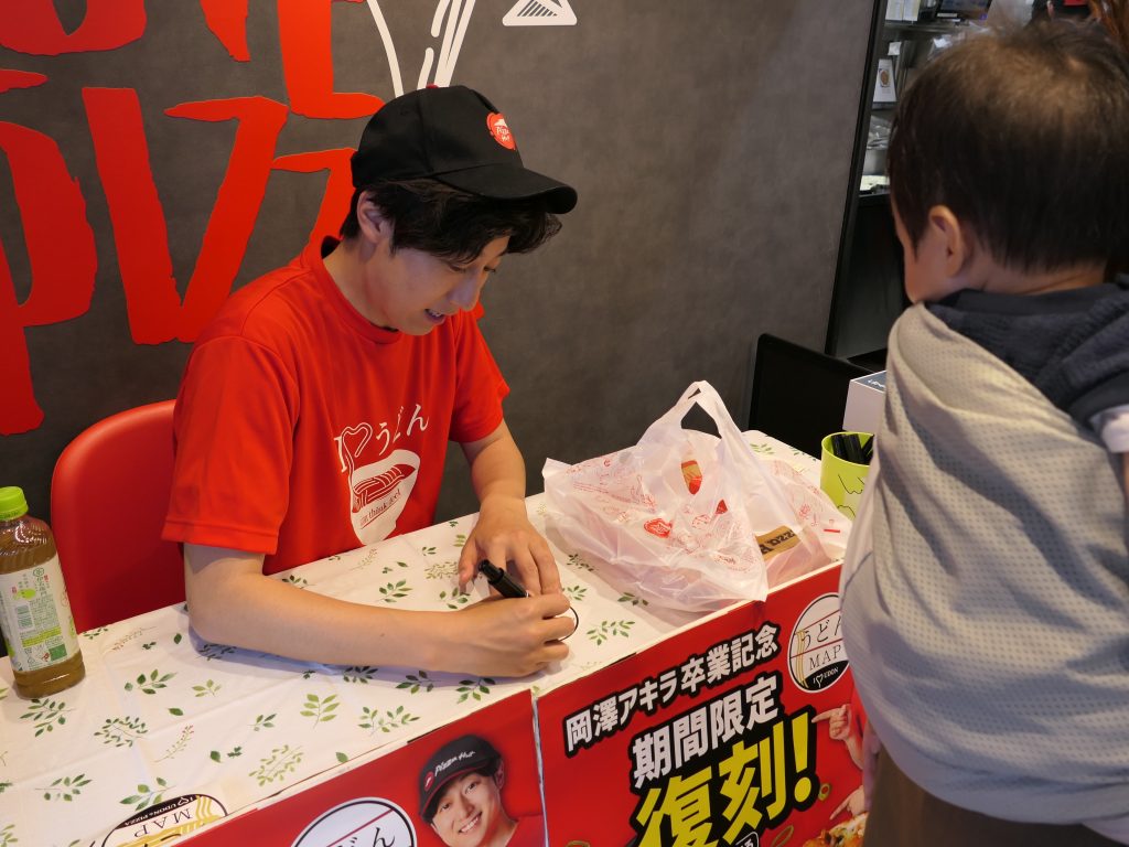 店頭で、お買い上げいただたお客様へ「オリジナルうどんMAPステッカー」にサインするアキラくん。
