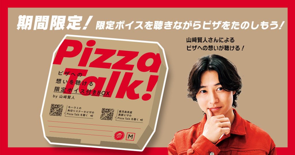 「Pizza Talk!」こだわりのピザをより一層美味しく召し上がっていただくために、俳優の山﨑賢人さんの“ピザへの想い”を聴きながらピザを味わうことができる音声コンテンツをご用意しました。ピザが入るBOX「ピザへの想いを聴ける限定ボイス付きBOX by 山﨑賢人」に印刷された二次元コードからアクセスいただけます。