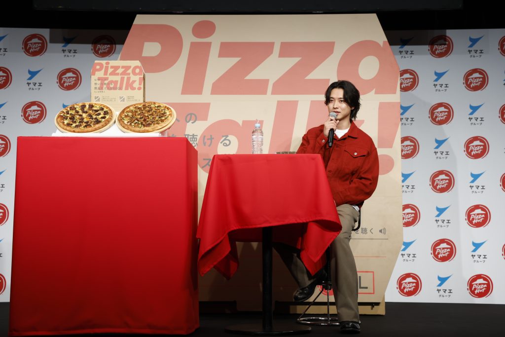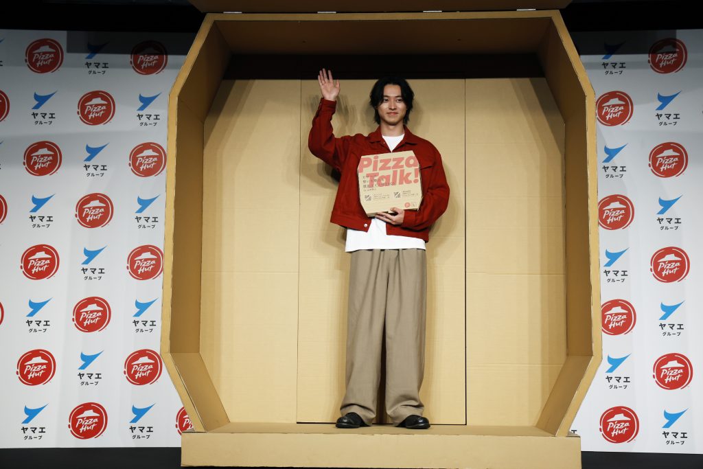 新TVCM「Pizza Talk! 牛ハラミピザ篇」に出演されている俳優の山﨑賢人さんが、巨大なピザBOXからご登場!巨大ピザBOXから登場した事について山﨑さんは「本当によく考えましたねこんなの。僕がピザになった気持ちでした(笑)」とコメントし会場が和やかな雰囲気に包まれました。