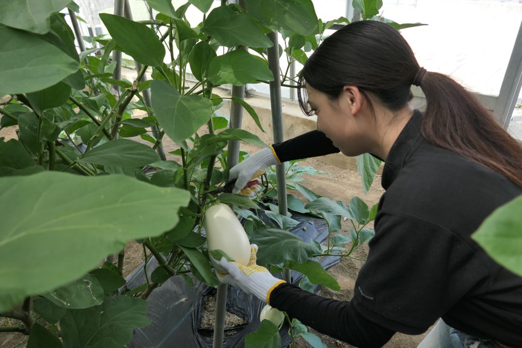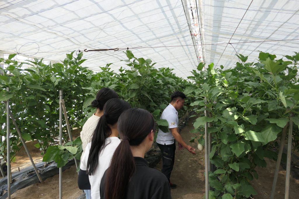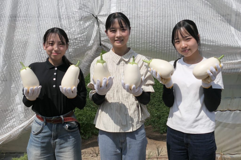 会社説明をしていただいた後、畑に移動し、宝石野菜(白なす)の収穫体験を行いました。学生たちは大ぶりでつややかな白なすを一つひとつ丁寧に収穫し、その新鮮さと重量感に驚いた様子でした。普段なかなか目にすることのない白なすが、手間をかけて丁寧に育てられていることを肌で感じる貴重な体験となりました。