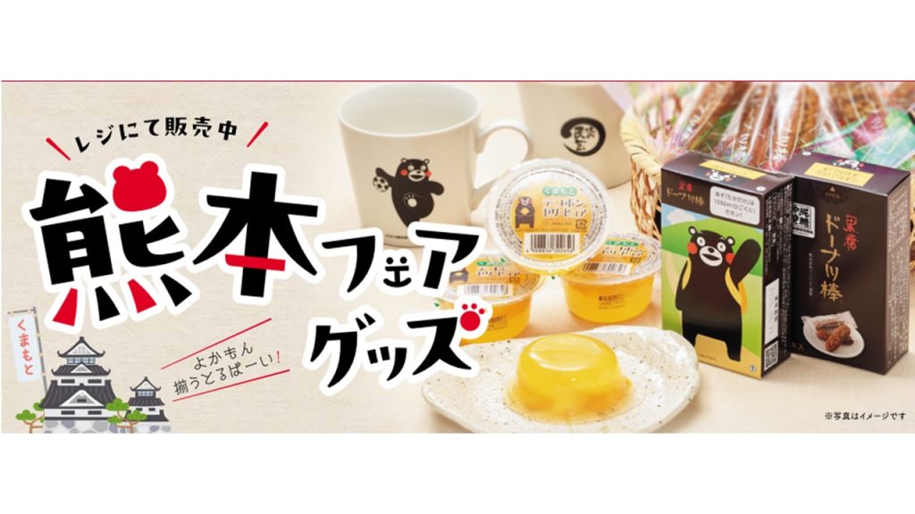 また、店舗のレジカウンターでは、くまモンのイラストが魅力的なフェアグッズを販売中。デコポンゼリーや黒糖ドーナツ棒など、熊本のご当地品をお買い求めいただけます。