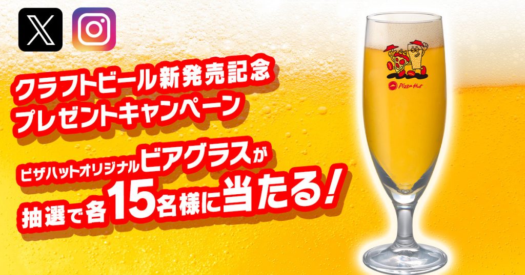 2025年10月27日(月)より、ピザハット公式Xアカウントと公式Instagramアカウントにて抽選で15名様ずつ計30名様に、クラフトビール新発売を記念して【オリジナルビアグラスとTHE PIZZA CRAFT1本】が当たるプレゼントキャンペーンを開催いたします。